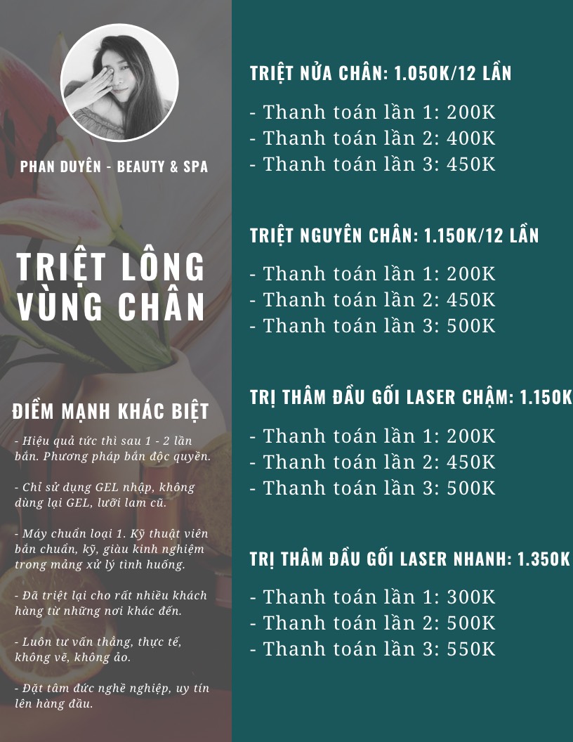Bảng giá dịch vụ triệt lông toàn diện tại Phan Duyên Spa - xin mời quý khách hàng tham khảo giá dịch vụ của Phan Duyên Spa và chọn dịch vụ mình cần nhé.Để biết thêm thêm thông tin và tư vấn trực tiếp xin vui lòng gọi cho Phan Duyên Spa.